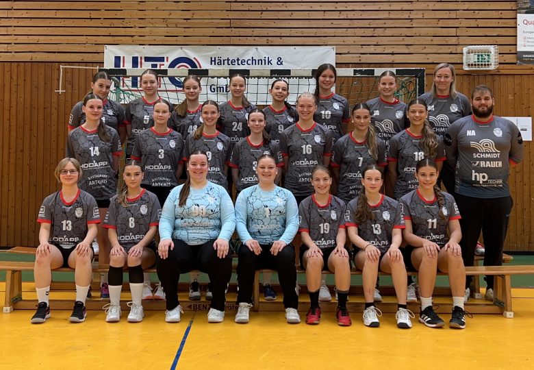 Mittlerer Reihe: Talina Frank, Lilly Braun, Marieke Brsagk, Marie Federle, Maria Ell, Polly Volz, Leni Roß, Dennis Bauer (Trainer)